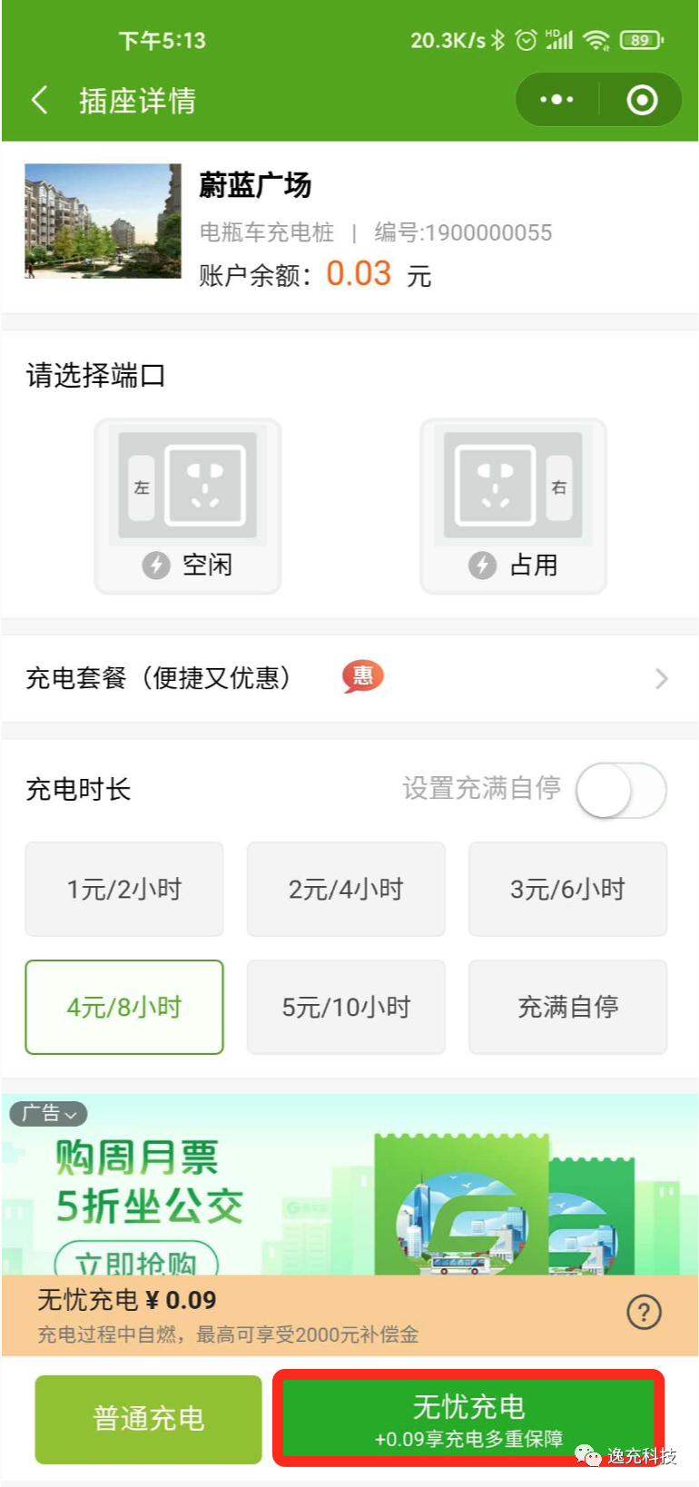 每次开启充电之前,确定好充电时长之后,选择【无忧充电】即可。