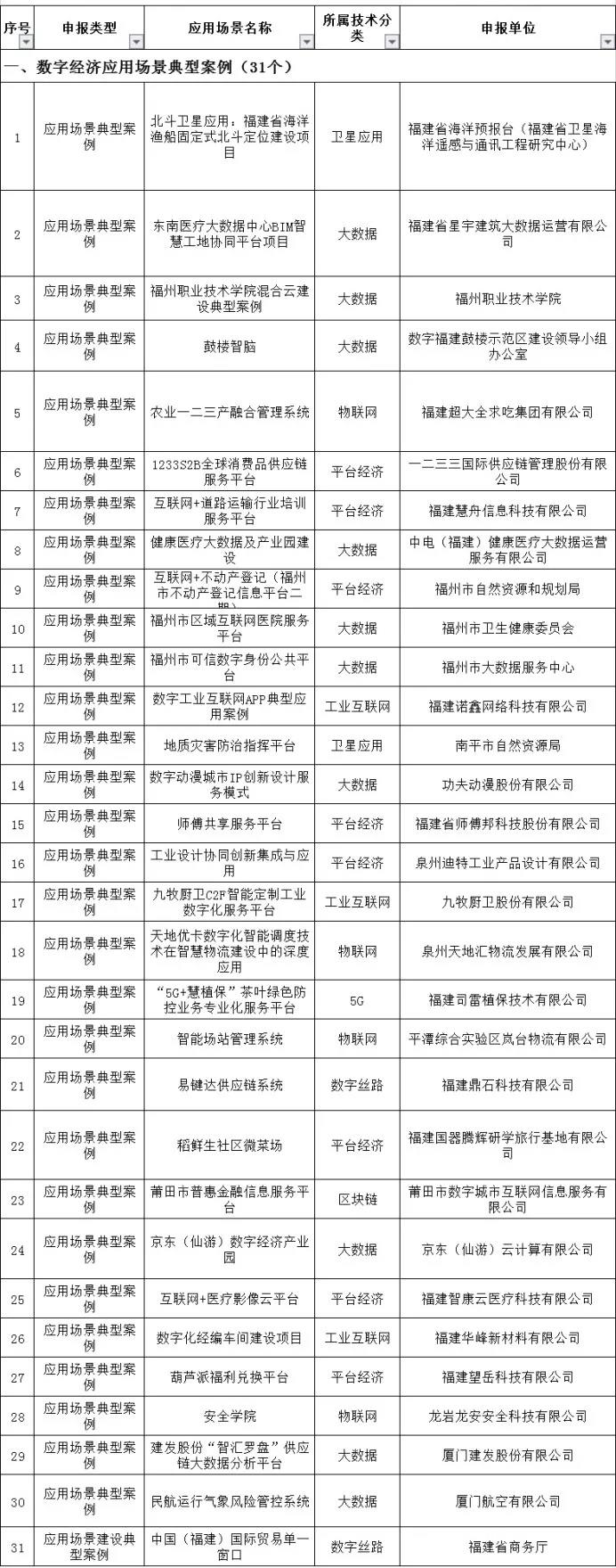 一是数字经济应用场景典型案例,共31项,这部分场景具有较高技术水准、完整解决方案、相对成熟应用模式,具备可复制性和示范推广性。其中具有代表性的有“鼓楼智脑”“东南医疗大数据中心BIM智慧工地协同平台项目”“中国(福建)国际贸易单一窗口”“福建省海洋渔船固定式北斗示位建设项目”等。