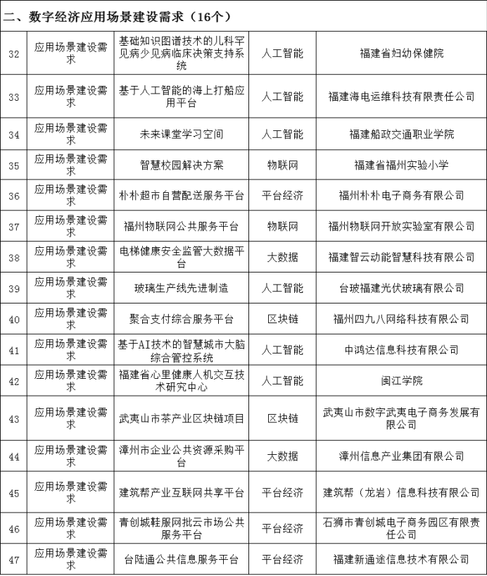 二是数字经济应用场景建设需求,共16项,这部分场景主要是数字经济新技术、新产品、新模式应用落地的建设需求,着力解决经济发展、社会治理、民生服务等重点领域中的痛点、难点、堵点问题。单个场景建设投资规模均在1000万元以上。其中具有代表性的有“基于知识图谱技术的儿科罕见病少见病临床决策支持系统”“基于人工智能的海上打船应用平台”“智慧校园解决方案”“福州物联网公共服务平台”等。